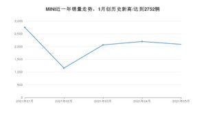 2021年5月,MINI销量为2087辆,同比下降23.3%,环比下降5.09%。1-5月份,MINI销量为10259辆,同比下降4.91%。在最近1年中,MINI销量在2021年01月达到最高,销量为2752辆。