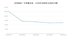 2021年5月,哈弗M6销量为12440辆,同比增长8.2%,环比增长1.82%。1-5月份,哈弗M6销量为77278辆,同比增长44.94%。在最近1年中,哈弗M6销量在2021年01月达到最高,销量为25173辆。