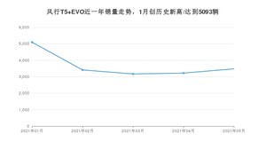 2021年5月,风行T5 EVO销量为3479辆,环比增长8.08%。1-5月份,风行T5 EVO销量为18370辆,在最近1年中,风行T5 EVO销量在2021年01月达到最高,销量为5093辆。