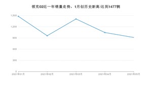 2021年5月,领克02销量为911辆,同比下降64.77%,环比下降12.66%。1-5月份,领克02销量为5794辆,同比下降34.95%。在最近1年中,领克02销量在2021年01月达到最高,销量为1477辆。