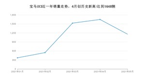 2021年5月,宝马iX3销量为1159辆,环比下降29.67%。1-5月份,宝马iX3销量为5248辆,在最近1年中,宝马iX3销量在2021年04月达到最高,销量为1648辆。