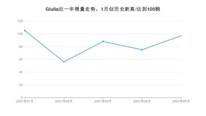 2021年5月,Giulia销量为97辆,同比下降17.8%,环比增长29.33%。1-5月份,Giulia销量为421辆,同比增长1.94%。在最近1年中,Giulia销量在2021年01月达到最高,销量为105辆。