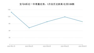 2021年5月,宝马8系销量为98辆,同比增长3.16%,环比下降17.65%。1-5月份,宝马8系销量为526辆,同比增长80.14%。在最近1年中,宝马8系销量在2021年01月达到最高,销量为139辆。