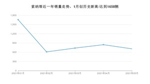 2021年5月,索纳塔销量为709辆,同比增长696.63%,环比下降16%。1-5月份,索纳塔销量为4555辆,同比增长1%。在最近1年中,索纳塔销量在2021年01月达到最高,销量为1658辆。