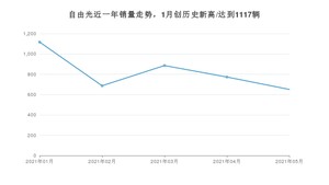 2021年5月,自由光销量为651辆,同比下降23.95%,环比下降15.78%。1-5月份,自由光销量为4114辆,同比增长1.43%。在最近1年中,自由光销量在2021年01月达到最高,销量为1117辆。