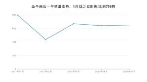 2021年5月,金牛座销量为650辆,同比下降14.59%,环比增长1.56%。1-5月份,金牛座销量为3190辆,同比增长46.33%。在最近1年中,金牛座销量在2021年01月达到最高,销量为796辆。
