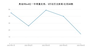 2021年5月,奥迪RS 4销量为14辆,同比增长40%,环比下降65%。1-5月份,奥迪RS 4销量为174辆,同比增长205.26%。在最近1年中,奥迪RS 4销量在2021年03月达到最高,销量为49辆。