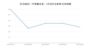 2021年5月,宝马M5销量为28辆,同比增长16.67%,环比下降20%。1-5月份,宝马M5销量为183辆,同比增长123.17%。在最近1年中,宝马M5销量在2021年01月达到最高,销量为59辆。