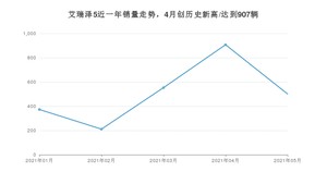 2021年5月,艾瑞泽5销量为501辆,同比下降19.84%,环比下降44.76%。1-5月份,艾瑞泽5销量为2545辆,同比增长121.3%。在最近1年中,艾瑞泽5销量在2021年04月达到最高,销量为907辆。