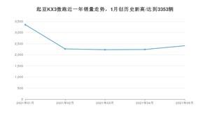 2021年5月,起亚KX3傲跑销量为2407辆,同比下降37.84%,环比增长7.5%。1-5月份,起亚KX3傲跑销量为12492辆,同比下降0.1%。在最近1年中,起亚KX3傲跑销量在2021年01月达到最高,销量为3353辆。