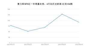 2021年5月,赛力斯SF5销量为110辆,同比增长14.58%,环比下降28.57%。1-5月份,赛力斯SF5销量为503辆,同比增长220.38%。在最近1年中,赛力斯SF5销量在2021年04月达到最高,销量为154辆。