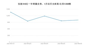 2021年5月,宝骏310销量为1003辆,同比下降32.37%,环比增长3.94%。1-5月份,宝骏310销量为5462辆,同比下降7.31%。在最近1年中,宝骏310销量在2021年01月达到最高,销量为1358辆。