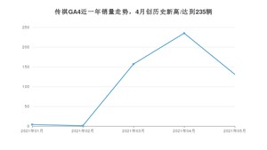 2021年5月,传祺GA4销量为131辆,同比增长1%,环比下降44.26%。1-5月份,传祺GA4销量为528辆,同比增长594.74%。在最近1年中,传祺GA4销量在2021年04月达到最高,销量为235辆。