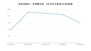 2021年5月,标致2008销量为148辆,同比增长43.69%,环比下降29.86%。1-5月份,标致2008销量为906辆,同比增长477.07%。在最近1年中,标致2008销量在2021年02月达到最高,销量为229辆。