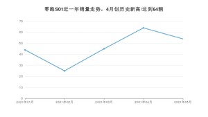 2021年5月,零跑S01销量为54辆,同比下降44.9%,环比下降15.63%。1-5月份,零跑S01销量为232辆,同比下降50%。在最近1年中,零跑S01销量在2021年04月达到最高,销量为64辆。