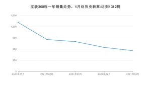 2021年5月,宝骏360销量为557辆,同比下降71.27%,环比下降13.64%。1-5月份,宝骏360销量为4169辆,同比下降62.75%。在最近1年中,宝骏360销量在2021年01月达到最高,销量为1312辆。