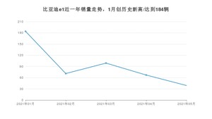 2021年5月,比亚迪e1销量为39辆,同比下降79.26%,环比下降41.79%。1-5月份,比亚迪e1销量为460辆,同比下降43.14%。在最近1年中,比亚迪e1销量在2021年01月达到最高,销量为184辆。