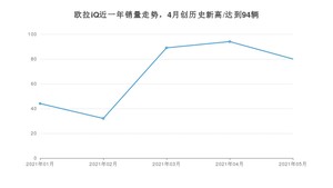 2021年5月,欧拉iQ销量为80辆,同比下降14.89%,环比下降14.89%。1-5月份,欧拉iQ销量为339辆,同比增长3.67%。在最近1年中,欧拉iQ销量在2021年04月达到最高,销量为94辆。