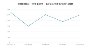 2021年5月,宝骏E200销量为1500辆,同比增长21.16%,环比增长31.69%。1-5月份,宝骏E200销量为6662辆,同比增长40.16%。在最近1年中,宝骏E200销量在2021年01月达到最高,销量为1621辆。