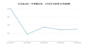 2021年5月,比亚迪e3销量为299辆,同比下降3.86%,环比增长5.65%。1-5月份,比亚迪e3销量为1906辆,同比增长65.16%。在最近1年中,比亚迪e3销量在2021年01月达到最高,销量为800辆。
