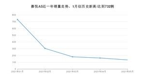 2021年5月,嘉悦A5销量为134辆,同比下降94.56%,环比下降17.28%。1-5月份,嘉悦A5销量为1512辆,同比下降88.4%。在最近1年中,嘉悦A5销量在2021年01月达到最高,销量为732辆。