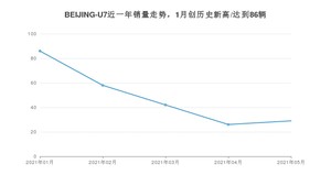 2021年5月,BEIJING-U7销量为29辆,同比下降94.11%,环比增长11.54%。1-5月份,BEIJING-U7销量为241辆,同比下降86.96%。在最近1年中,BEIJING-U7销量在2021年01月达到最高,销量为86辆。
