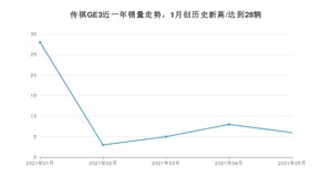 2021年5月,传祺GE3销量为6辆,同比下降91.78%,环比下降25%。1-5月份,传祺GE3销量为50辆,同比下降85.92%。在最近1年中,传祺GE3销量在2021年01月达到最高,销量为28辆。