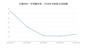 2021年5月,汉腾X5销量为15辆,同比下降75.41%,环比增长36.36%。1-5月份,汉腾X5销量为134辆,同比下降78.66%。在最近1年中,汉腾X5销量在2021年01月达到最高,销量为65辆。
