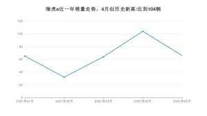 2021年5月,瑞虎e销量为66辆,同比下降51.47%,环比下降36.54%。1-5月份,瑞虎e销量为331辆,同比下降43.32%。在最近1年中,瑞虎e销量在2021年04月达到最高,销量为104辆。