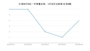 2021年5月,江淮iEV7S销量为4辆,同比增长100%,环比增长300%。1-5月份,江淮iEV7S销量为19辆,同比增长137.5%。在最近1年中,江淮iEV7S销量在2021年01月达到最高,销量为6辆。