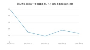 2021年5月,BEIJING-EX5销量为13辆,同比下降60.61%,环比下降27.78%。1-5月份,BEIJING-EX5销量为103辆,同比下降50.24%。在最近1年中,BEIJING-EX5销量在2021年01月达到最高,销量为48辆。