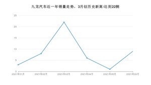 在国内市场上,九龙汽车在2021年6月的销量为9辆,同比下降59.09%,环比增长800%。1-6月份,九龙汽车累计销量为49辆,较去年同期下降24.62%。
