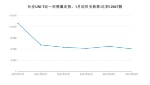 2021年6月,长安UNI-T销量为6055辆,同比下降4.36%,环比下降9.92%。1-6月份,长安UNI-T销量为45370辆,同比增长522.87%。在最近1年中,长安UNI-T销量在2021年01月达到最高,销量为12847辆。