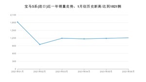 2021年6月,宝马5系(进口)销量为1211辆,同比增长68.43%,环比增长1.94%。1-6月份,宝马5系(进口)销量为7533辆,同比增长48.46%。在最近1年中,宝马5系(进口)销量在2021年01月达到最高,销量为1821辆。