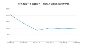 2021年6月,K5凯酷销量为1007辆,同比增长488.89%,环比增长4.9%。1-6月份,K5凯酷销量为7248辆,同比增长520.55%。在最近1年中,K5凯酷销量在2021年01月达到最高,销量为2037辆。