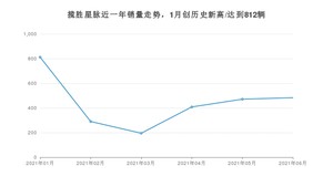 2021年6月,揽胜星脉销量为483辆,同比下降10.22%,环比增长2.55%。1-6月份,揽胜星脉销量为2659辆,同比增长6.32%。在最近1年中,揽胜星脉销量在2021年01月达到最高,销量为812辆。