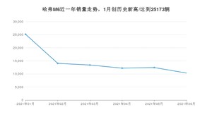 2021年6月,哈弗M6销量为10337辆,同比下降5.18%,环比下降16.91%。1-6月份,哈弗M6销量为87615辆,同比增长36.43%。在最近1年中,哈弗M6销量在2021年01月达到最高,销量为25173辆。
