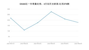 2021年6月,Ghibli销量为178辆,同比增长27.14%,环比下降15.24%。1-6月份,Ghibli销量为1167辆,同比增长128.38%。在最近1年中,Ghibli销量在2021年04月达到最高,销量为276辆。