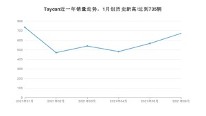 2021年6月,Taycan销量为672辆,同比增长1%,环比增长18.73%。1-6月份,Taycan销量为3463辆,同比增长2%。在最近1年中,Taycan销量在2021年01月达到最高,销量为735辆。