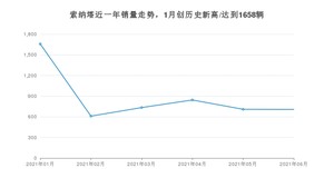 2021年6月,索纳塔销量为707辆,同比增长806.41%,环比下降0.28%。1-6月份,索纳塔销量为5262辆,同比增长1%。在最近1年中,索纳塔销量在2021年01月达到最高,销量为1658辆。