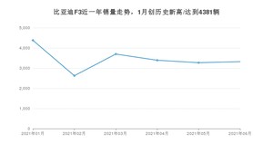 2021年6月,比亚迪F3销量为3322辆,同比增长42.58%,环比增长1.56%。1-6月份,比亚迪F3销量为20691辆,同比增长54.94%。在最近1年中,比亚迪F3销量在2021年01月达到最高,销量为4381辆。