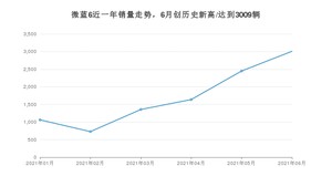 2021年6月,微蓝6销量为3009辆,同比增长650.37%,环比增长22.87%。1-6月份,微蓝6销量为10242辆,同比增长438.2%。在最近1年中,微蓝6销量在2021年06月达到最高,销量为3009辆。