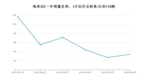 2021年6月,瑞虎3销量为34辆,同比下降92%,环比增长25.93%。1-6月份,瑞虎3销量为347辆,同比下降86.8%。在最近1年中,瑞虎3销量在2021年01月达到最高,销量为116辆。