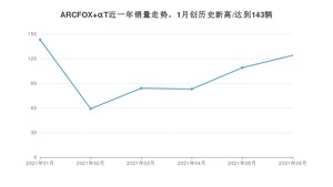 2021年6月,ARCFOX αT销量为124辆,环比增长13.76%。1-6月份,ARCFOX αT销量为602辆,在最近1年中,ARCFOX αT销量在2021年01月达到最高,销量为143辆。