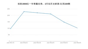 2021年6月,标致2008销量为102辆,同比下降9.73%,环比下降31.08%。1-6月份,标致2008销量为1008辆,同比增长273.33%。在最近1年中,标致2008销量在2021年02月达到最高,销量为229辆。