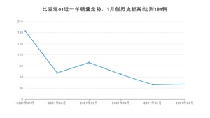 2021年6月,比亚迪e1销量为41辆,同比下降76.97%,环比增长5.13%。1-6月份,比亚迪e1销量为501辆,同比下降49.24%。在最近1年中,比亚迪e1销量在2021年01月达到最高,销量为184辆。