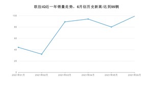 2021年6月,欧拉iQ销量为99辆,同比增长17.86%,环比增长23.75%。1-6月份,欧拉iQ销量为438辆,同比增长6.57%。在最近1年中,欧拉iQ销量在2021年06月达到最高,销量为99辆。