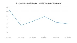 2021年6月,宝沃BX5销量为303辆,同比增长10.99%,环比下降11.4%。1-6月份,宝沃BX5销量为2401辆,同比下降21.84%。在最近1年中,宝沃BX5销量在2021年01月达到最高,销量为640辆。