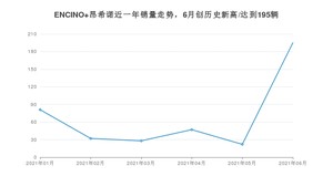 2021年6月,ENCINO 昂希诺销量为195辆,同比下降46.72%,环比增长786.36%。1-6月份,ENCINO 昂希诺销量为405辆,同比下降81.73%。在最近1年中,ENCINO 昂希诺销量在2021年06月达到最高,销量为195辆。