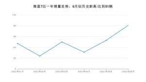 2021年6月,微蓝7销量为81辆,同比增长2%,环比增长52.83%。1-6月份,微蓝7销量为286辆,同比增长9%。在最近1年中,微蓝7销量在2021年06月达到最高,销量为81辆。